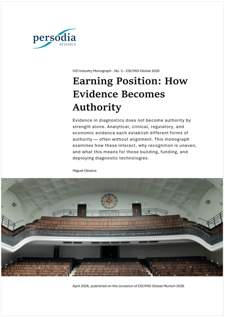 The monograph draws on the structural framework developed in Inside the Clinical Diagnostics Industry: Constraints Shaping Strategy — Towards Health Intelligence (Oliveira, 2026) and on direct field observation at ESCMID Global Munich 2026. It is the second publication in the IVD Industry Monograph series — the primary analytical output of Persodia Research.